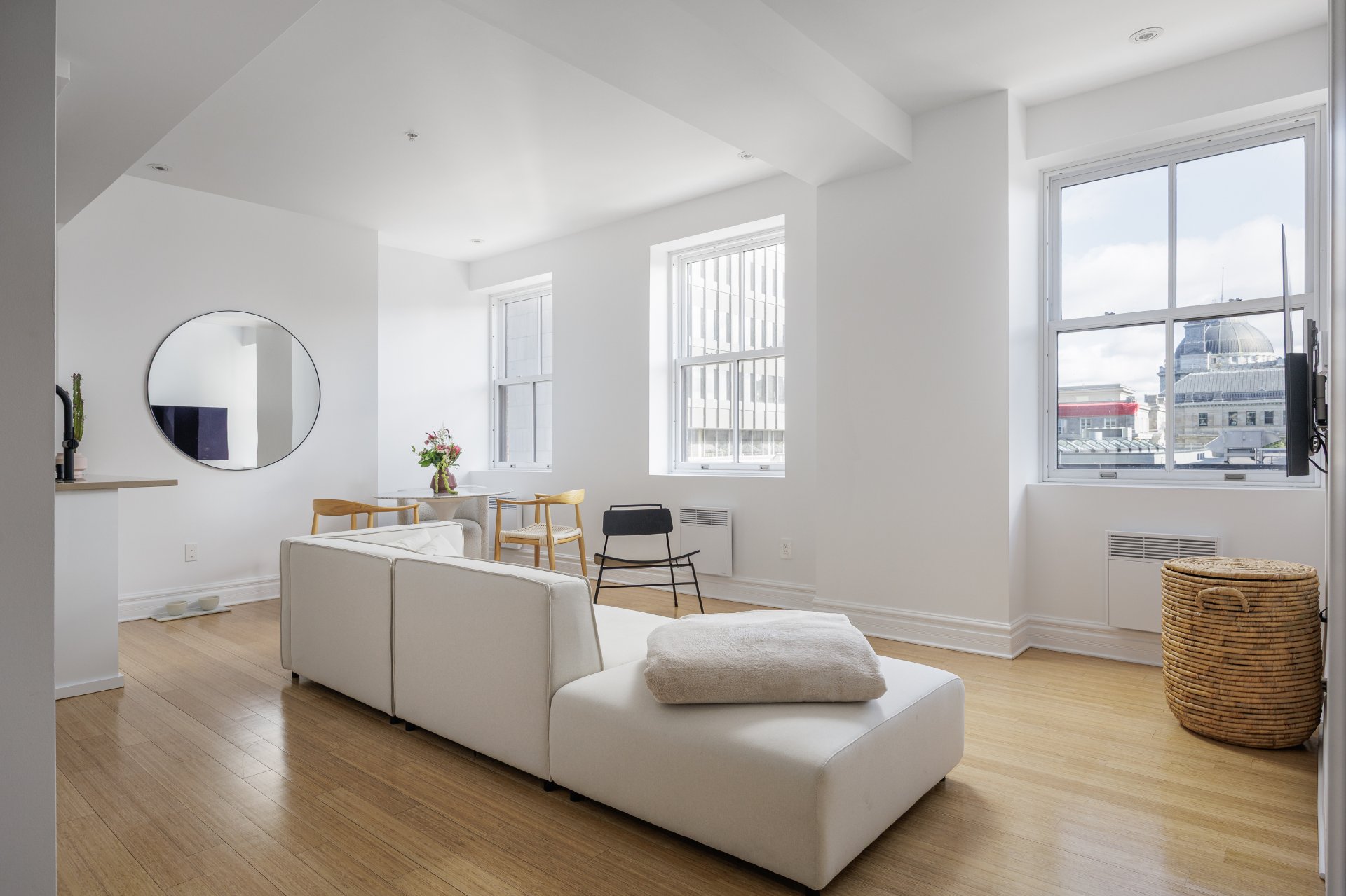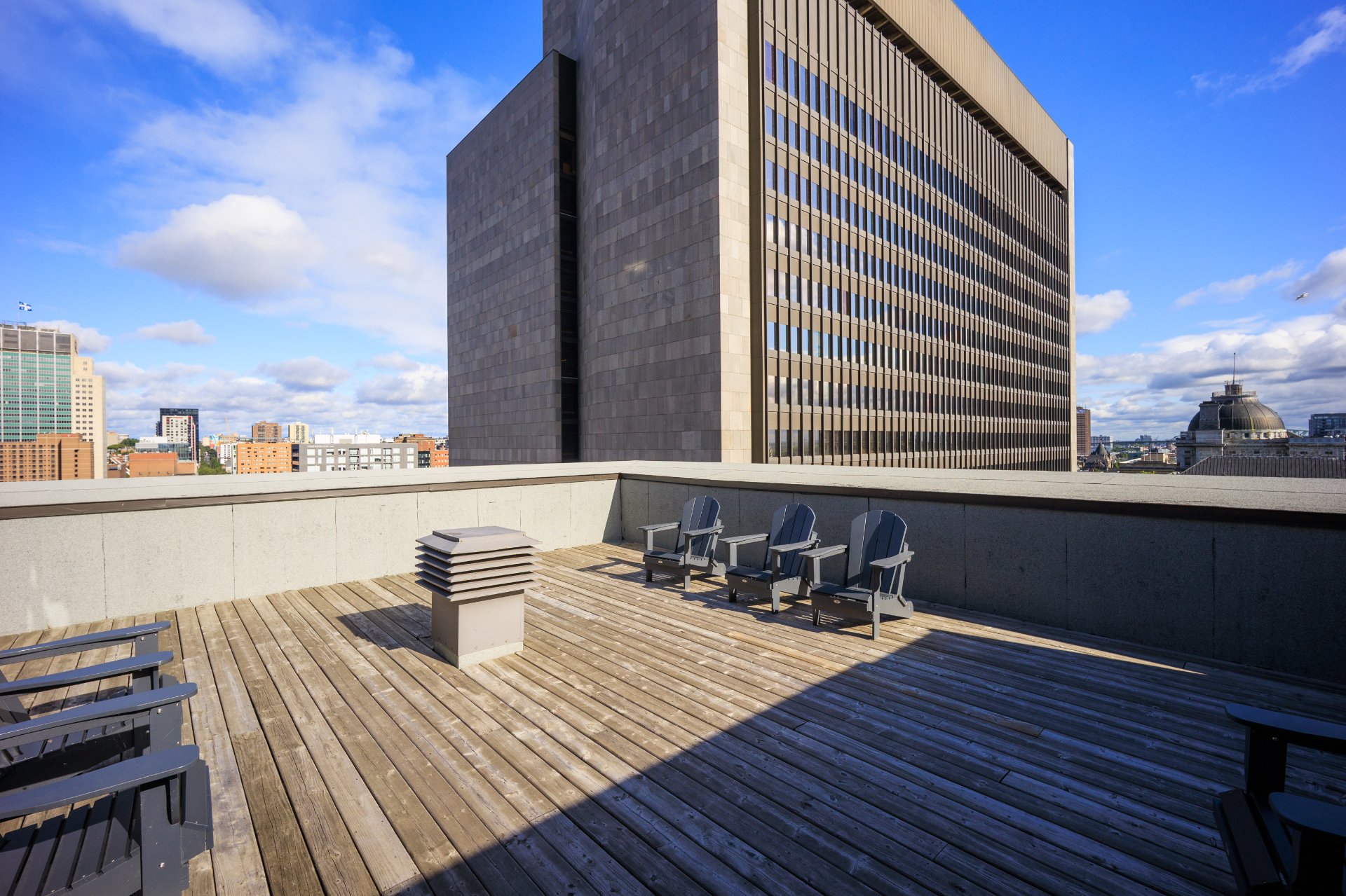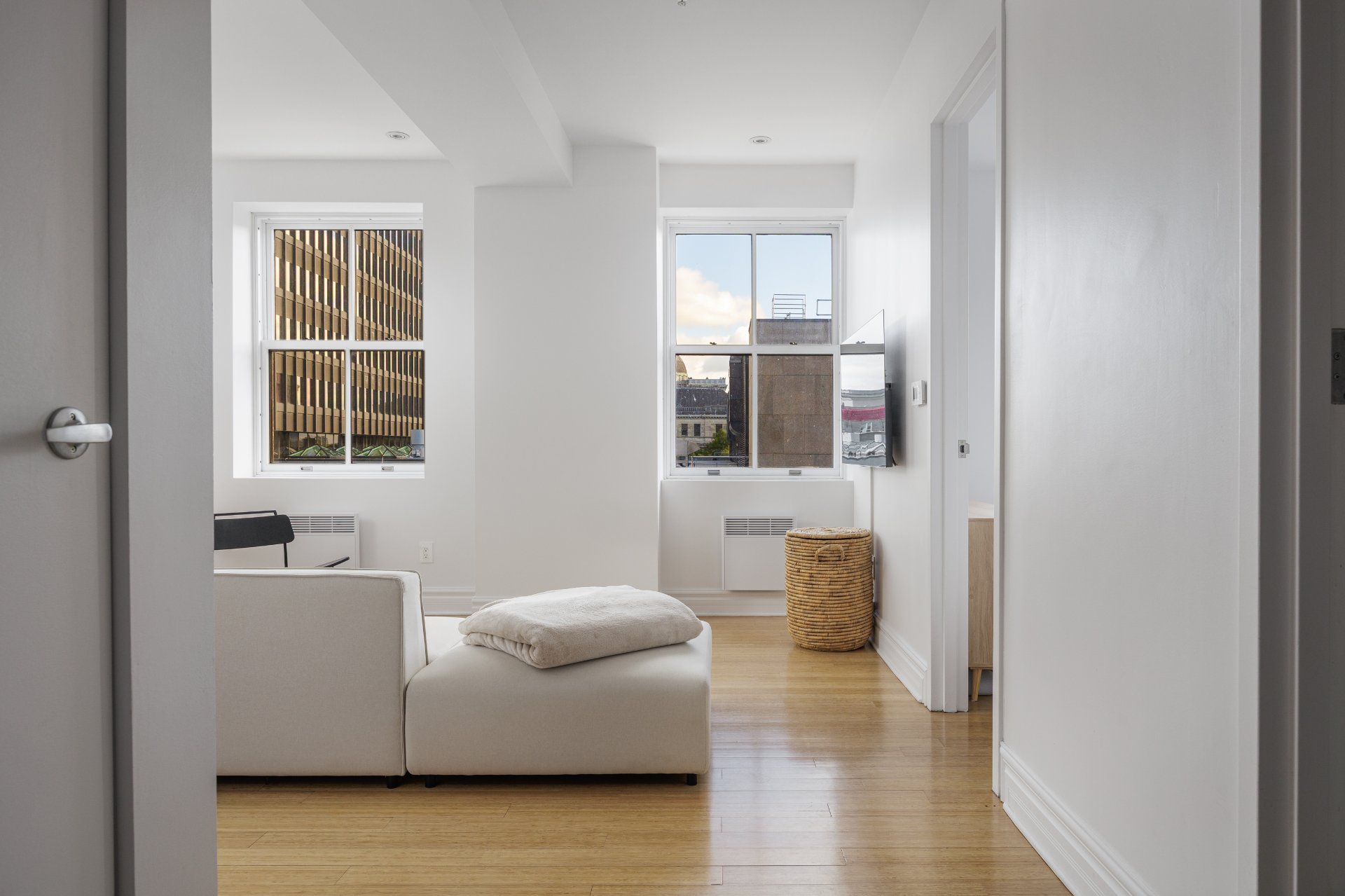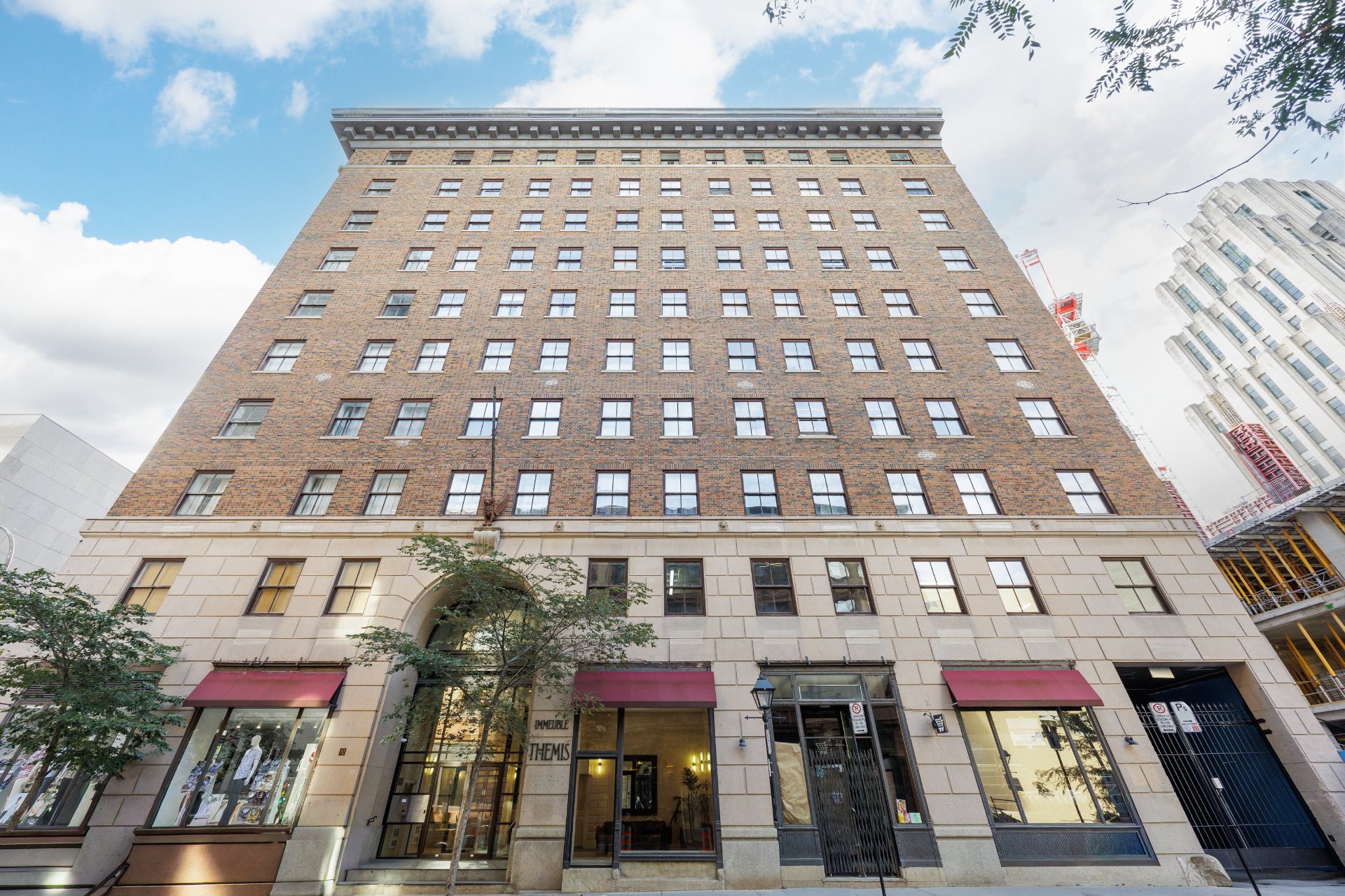 Bienvenue au Thémis suite 605 - walk-score de 100! Au coeur du quartier judiciaire, à deux pas du Palais de Justice, de la Cour d'appel, du nouveau Palais fédéral, métro Place d'Armes, cet immeuble patrimonial de 1928 marie l'élégance histoire et confort moderne. Lumineux condo divise de 521 pc, abondance de lumière, cuisine en quartz, chambre queen avec stores motorisés, planchers bamboo remis à neuf, entrée intelligente et remise. Terrasse sur le toit, gym dans l'ancienne voûte. Idéal pour avocats, professionnels du CHUM, premier achat, pied-à terre ou investissement. Clé en main, facile à visiter, occupation rapide.