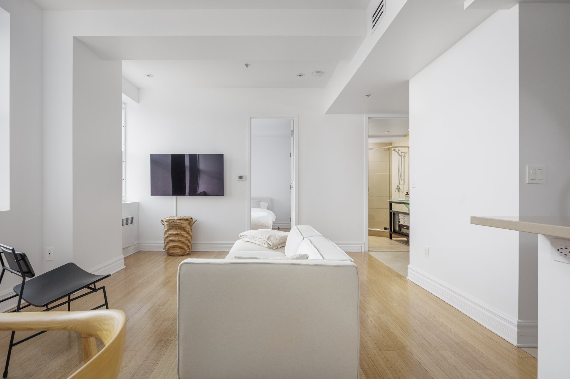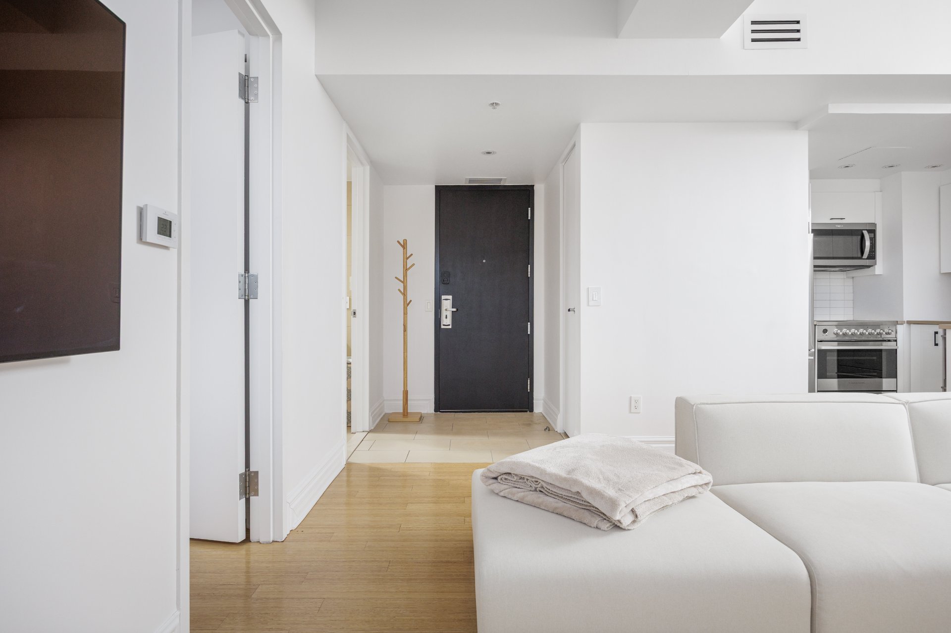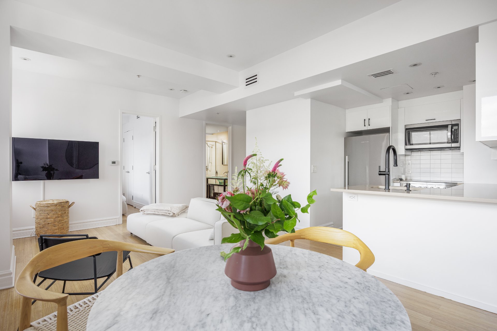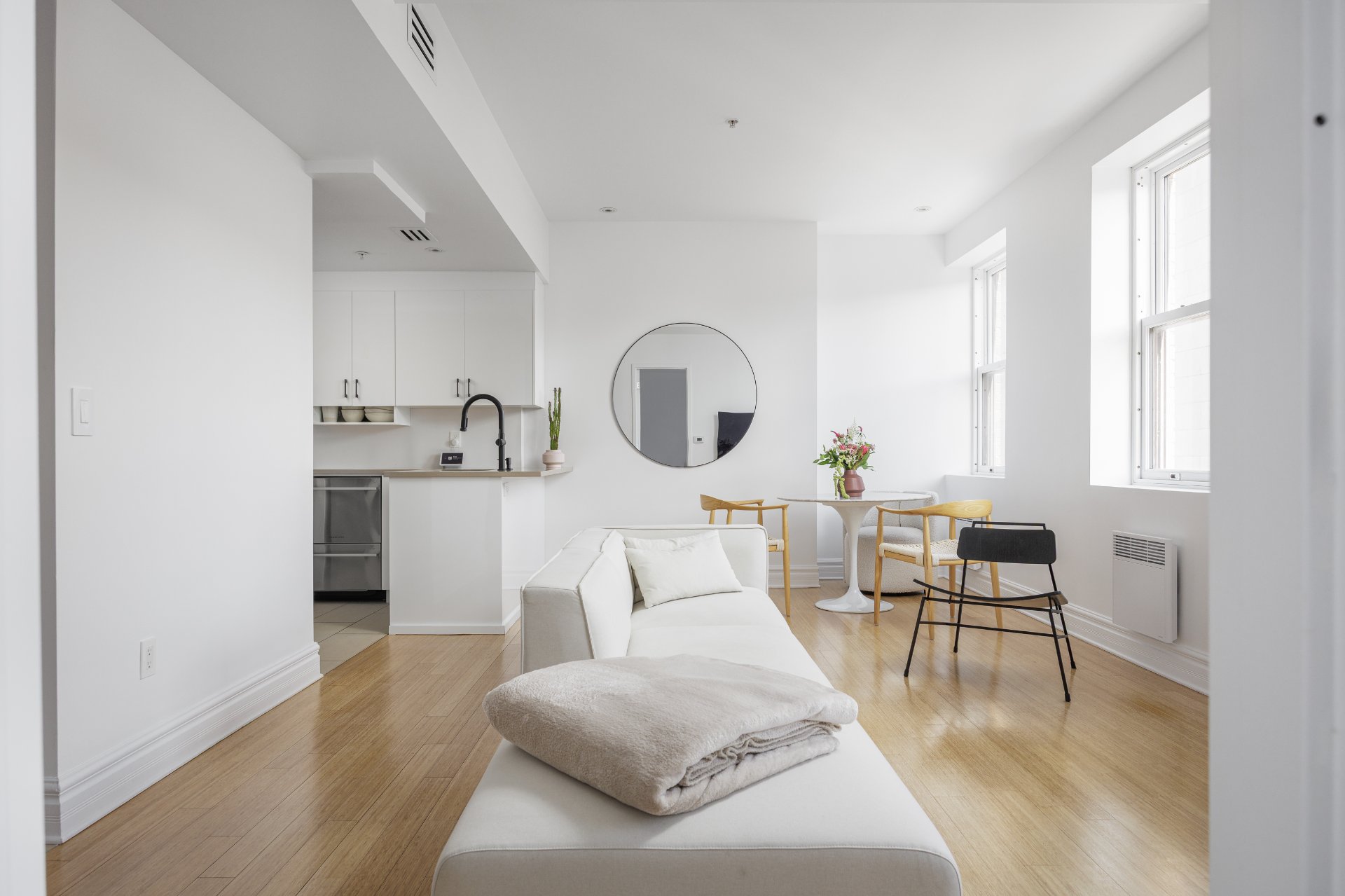 Bienvenue au Thémis suite 605 - walk-score de 100! Au coeur du quartier judiciaire, à deux pas du Palais de Justice, de la Cour d'appel, du nouveau Palais fédéral, métro Place d'Armes, cet immeuble patrimonial de 1928 marie l'élégance histoire et confort moderne. Lumineux condo divise de 521 pc, abondance de lumière, cuisine en quartz, chambre queen avec stores motorisés, planchers bamboo remis à neuf, entrée intelligente et remise. Terrasse sur le toit, gym dans l'ancienne voûte. Idéal pour avocats, professionnels du CHUM, premier achat, pied-à terre ou investissement. Clé en main, facile à visiter, occupation rapide.