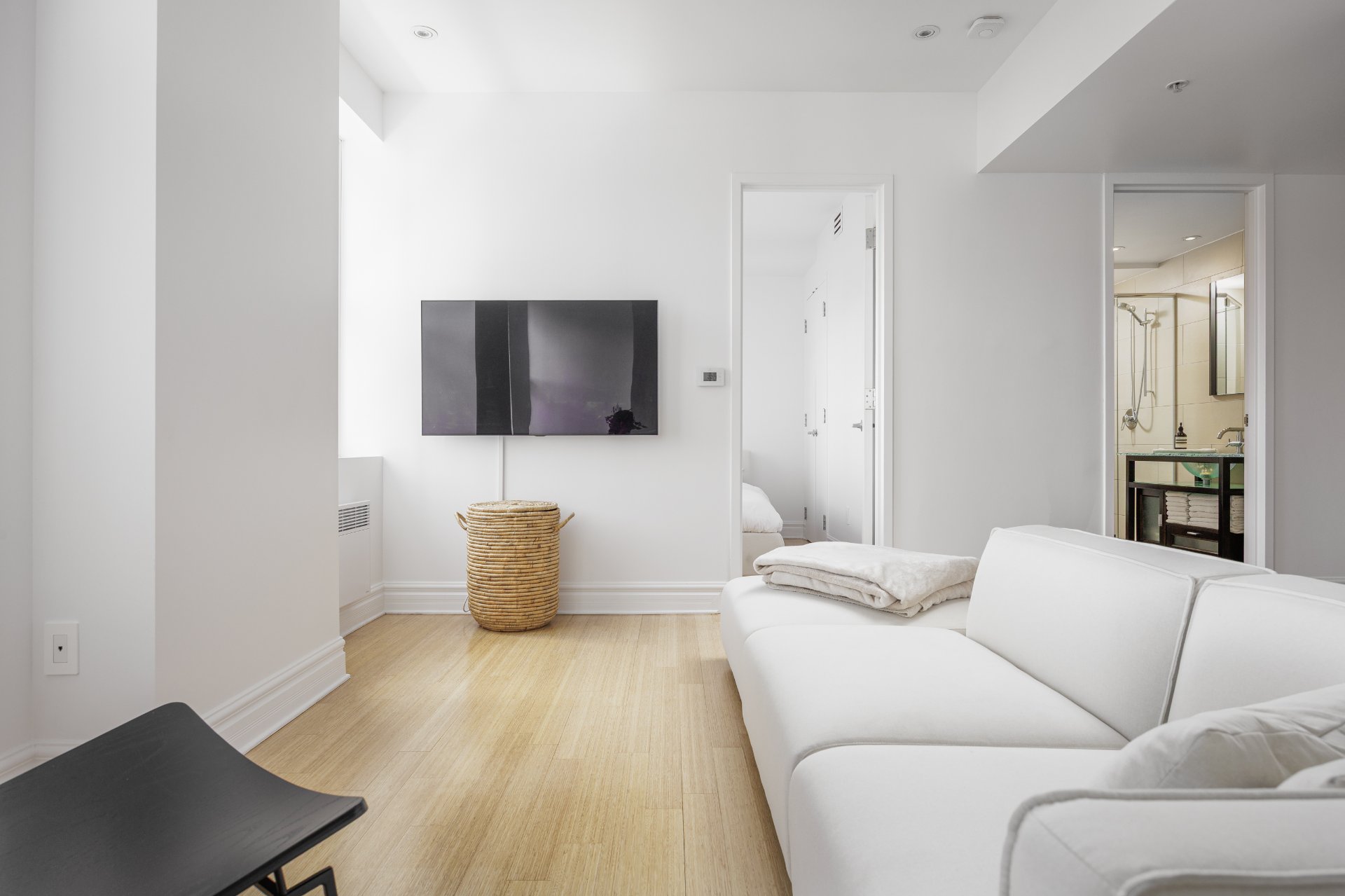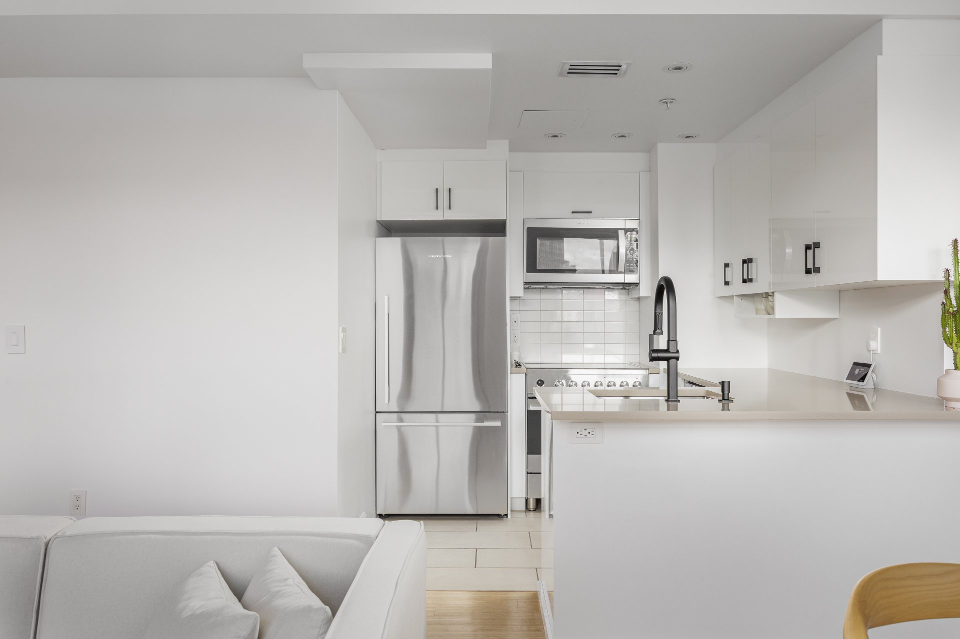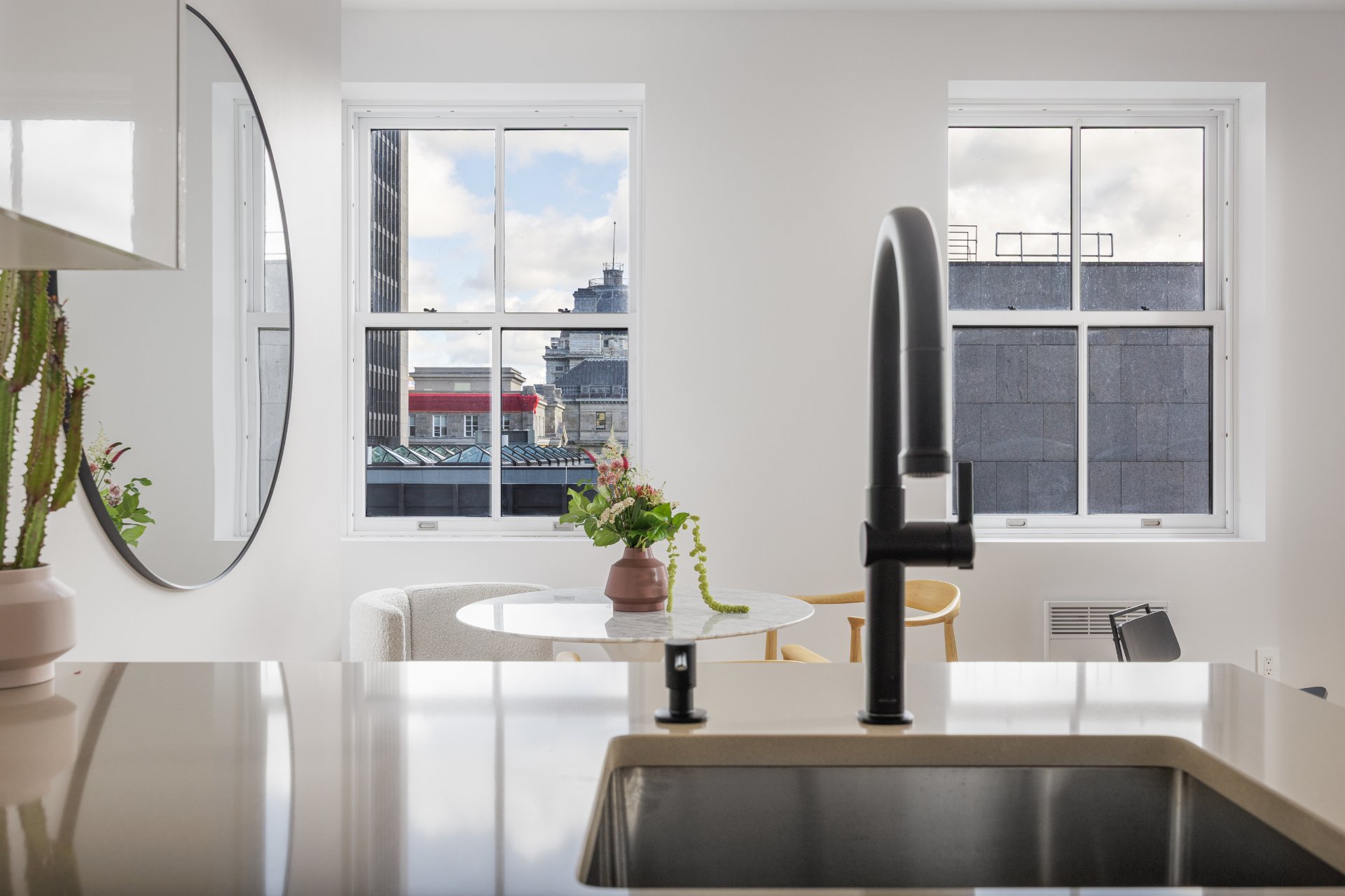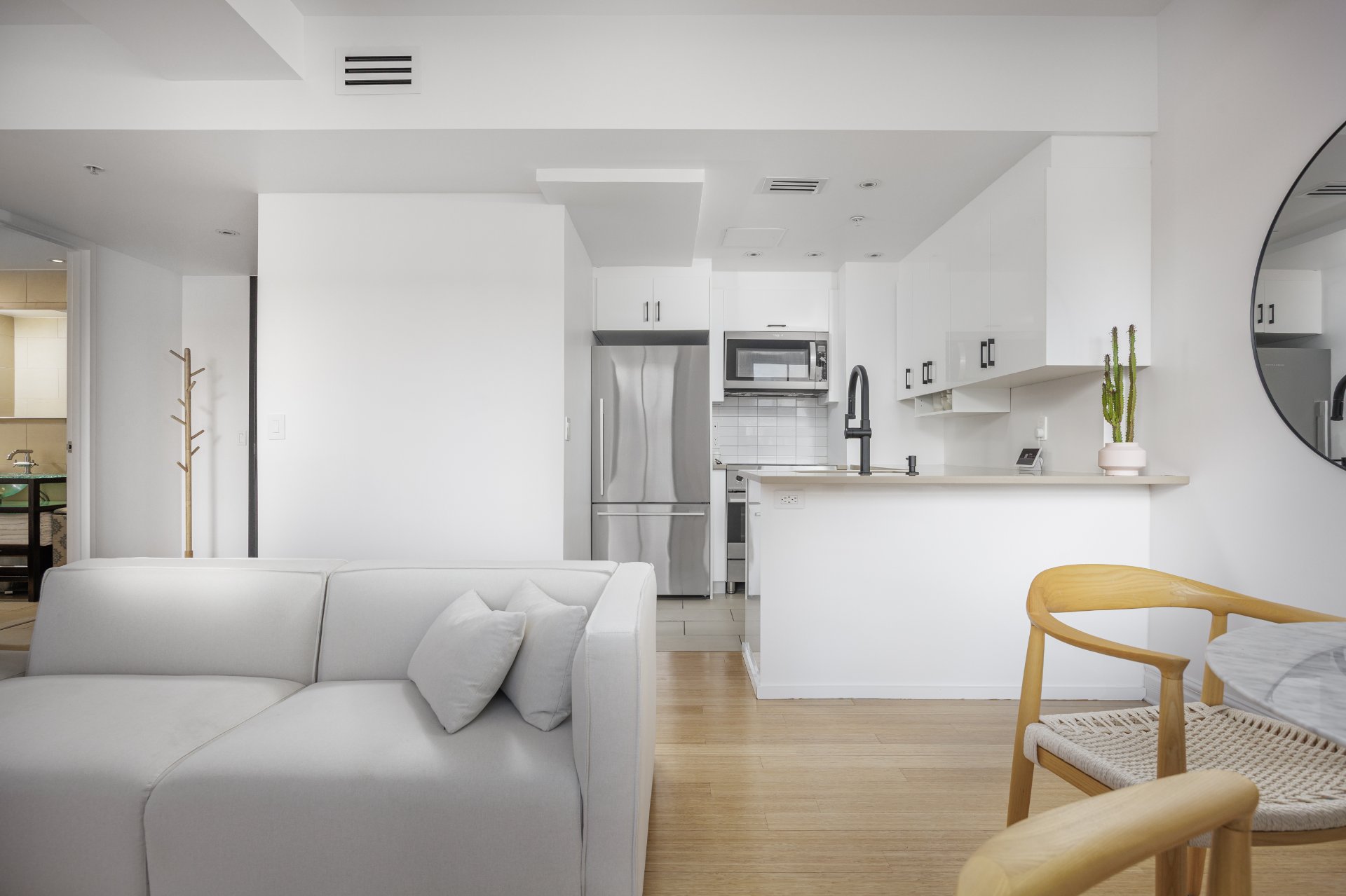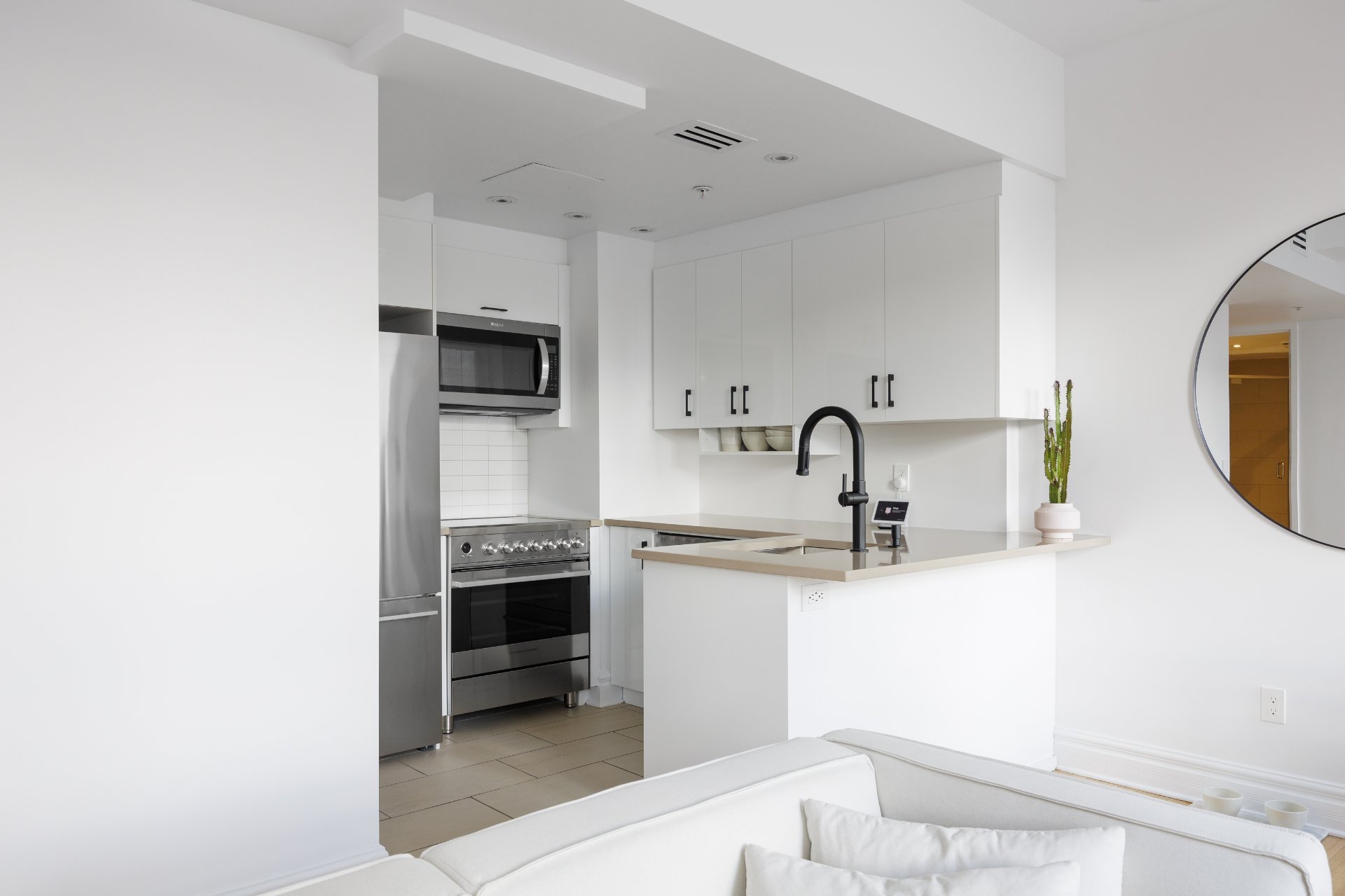 Bienvenue au Thémis suite 605 - walk-score de 100! Au coeur du quartier judiciaire, à deux pas du Palais de Justice, de la Cour d'appel, du nouveau Palais fédéral, métro Place d'Armes, cet immeuble patrimonial de 1928 marie l'élégance histoire et confort moderne. Lumineux condo divise de 521 pc, abondance de lumière, cuisine en quartz, chambre queen avec stores motorisés, planchers bamboo remis à neuf, entrée intelligente et remise. Terrasse sur le toit, gym dans l'ancienne voûte. Idéal pour avocats, professionnels du CHUM, premier achat, pied-à terre ou investissement. Clé en main, facile à visiter, occupation rapide.