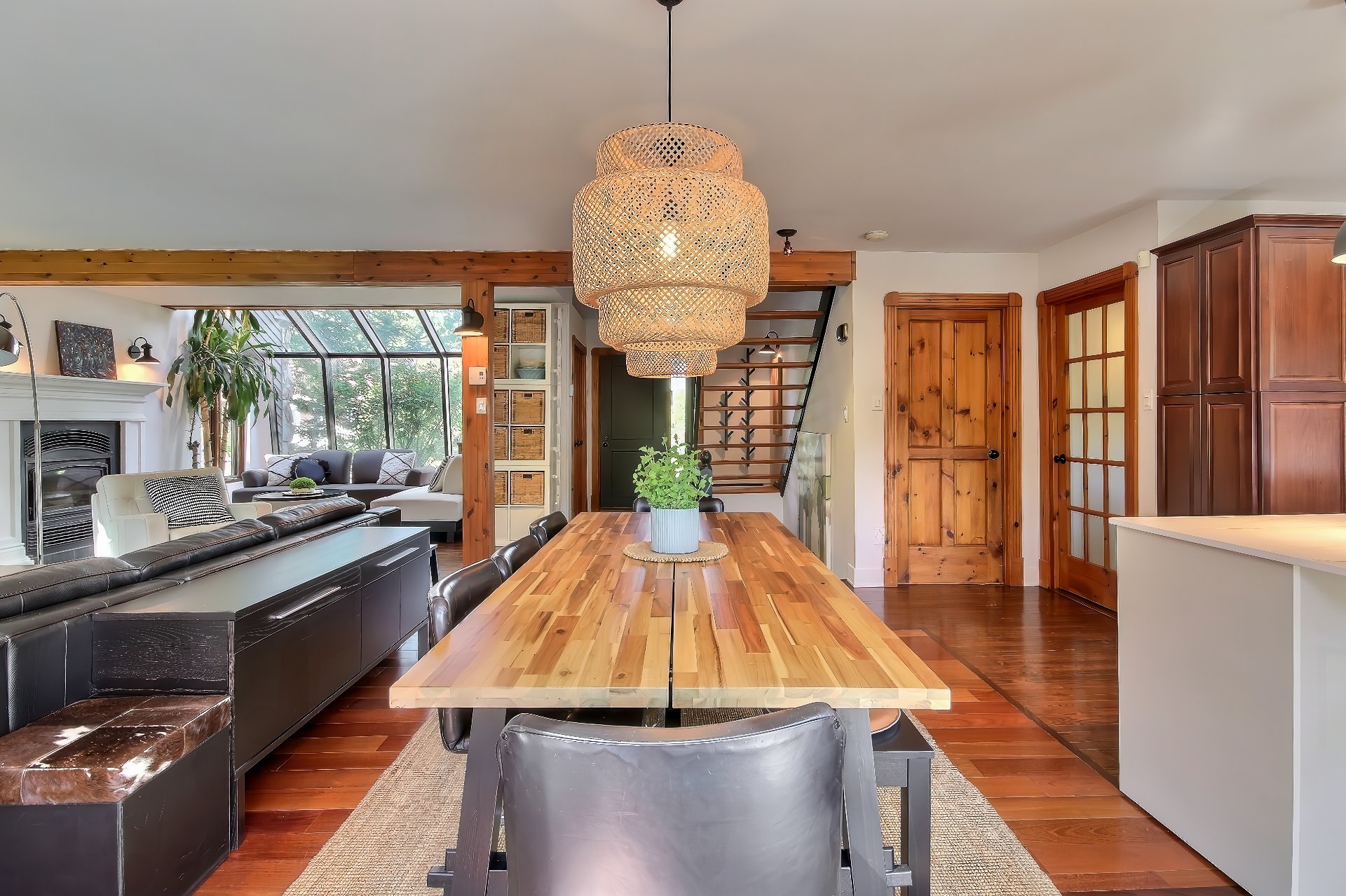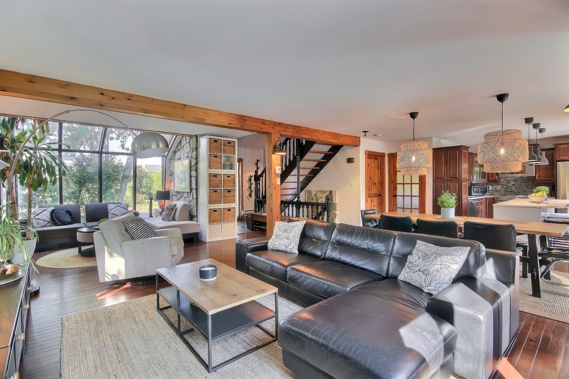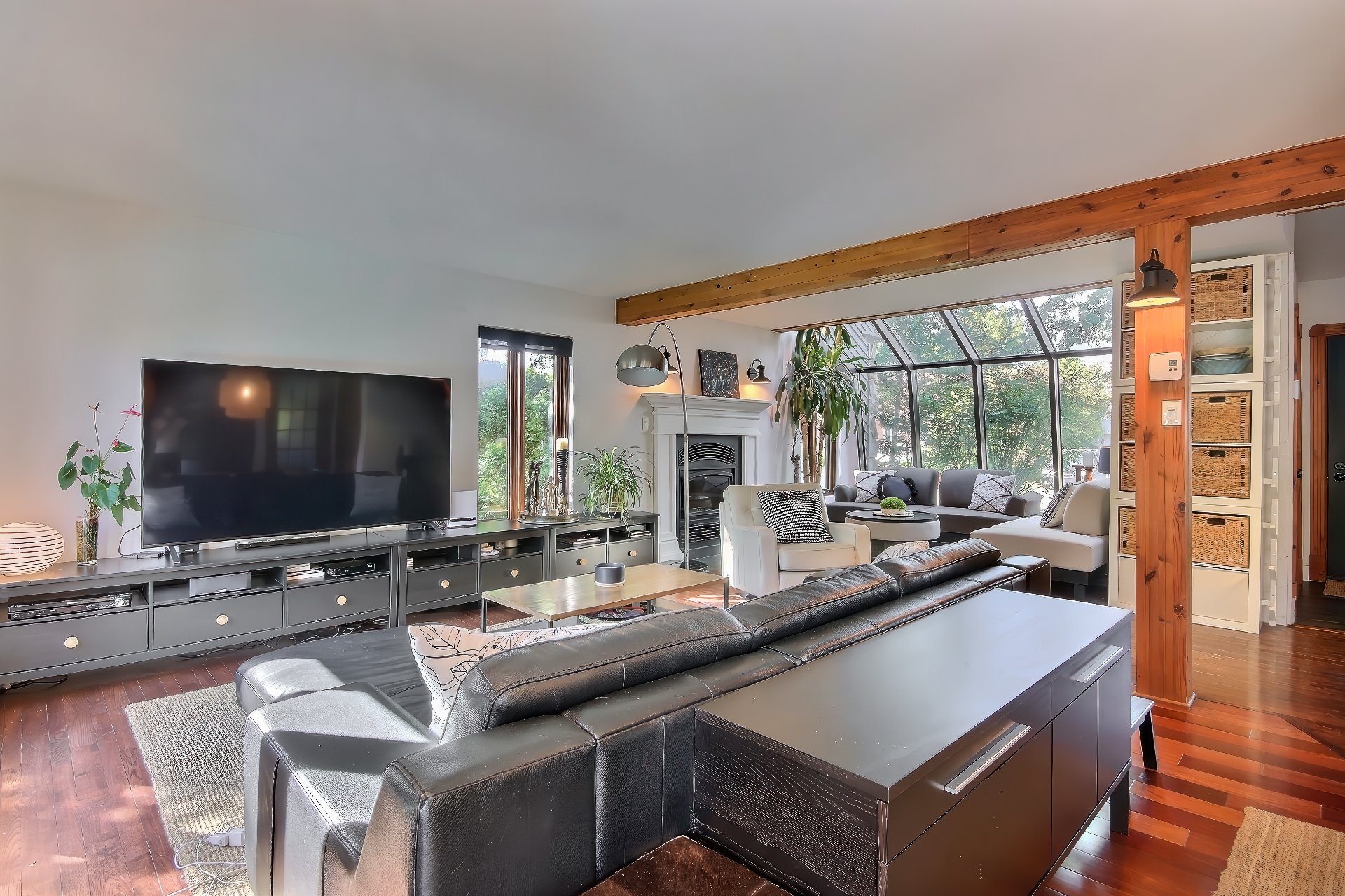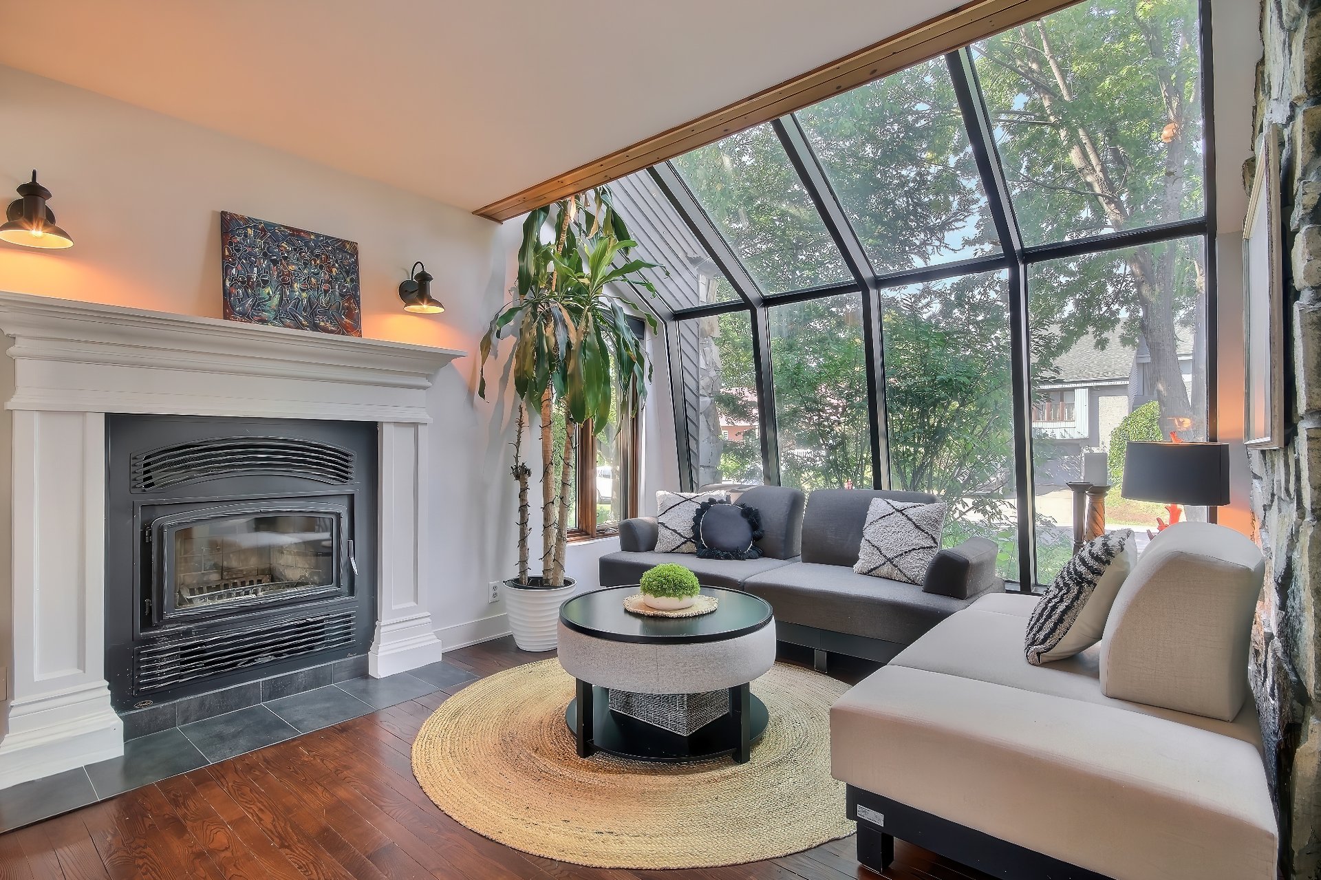 foyer au bois et la verrière inondée de lumière créent un