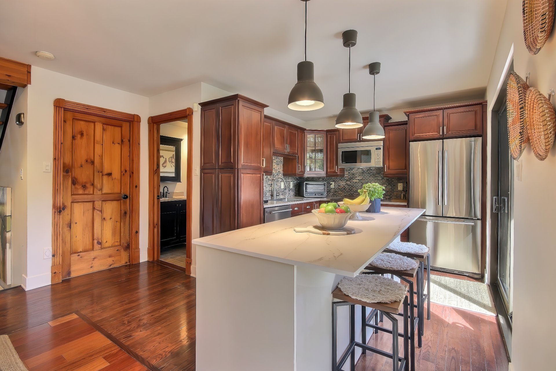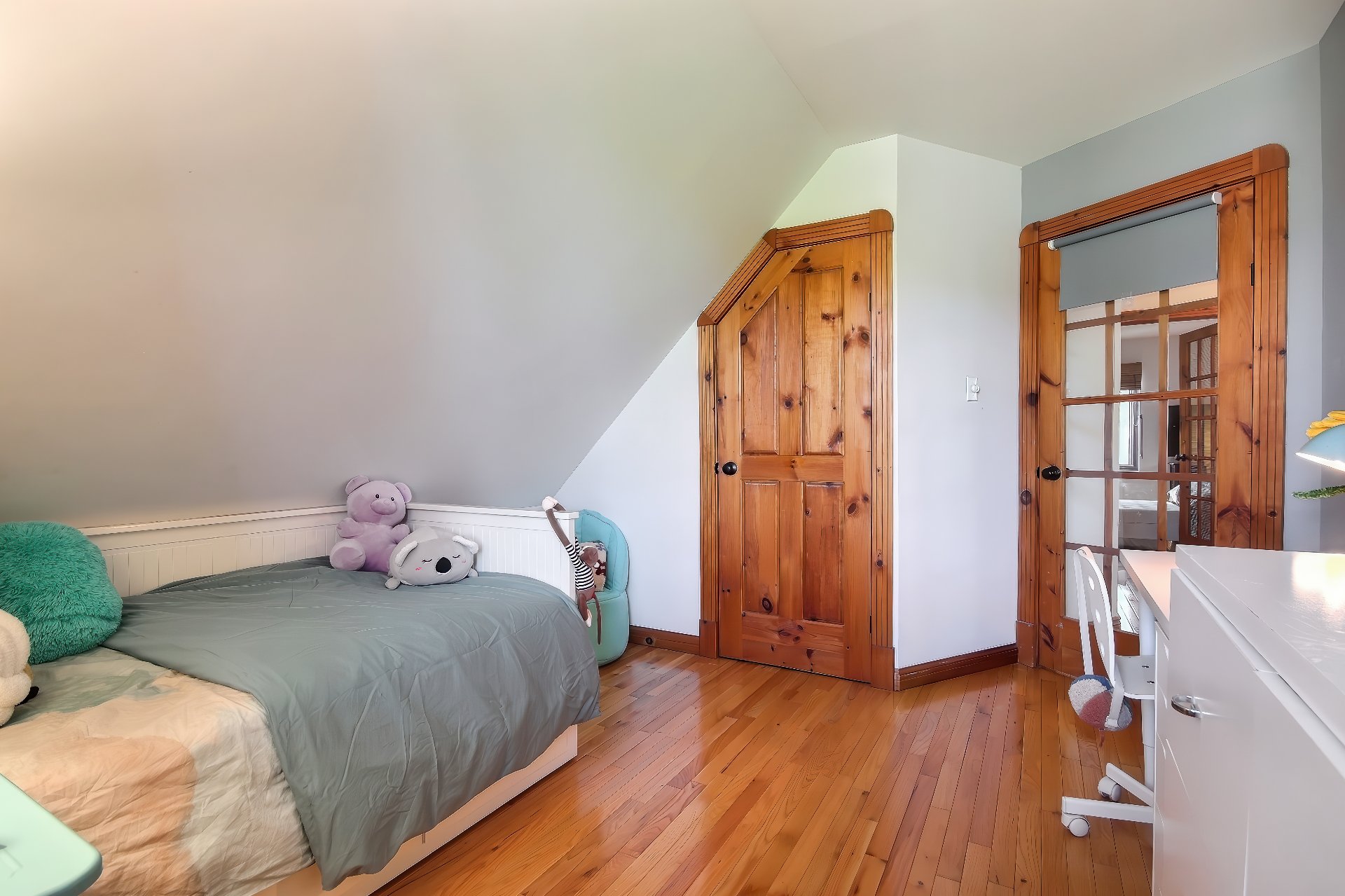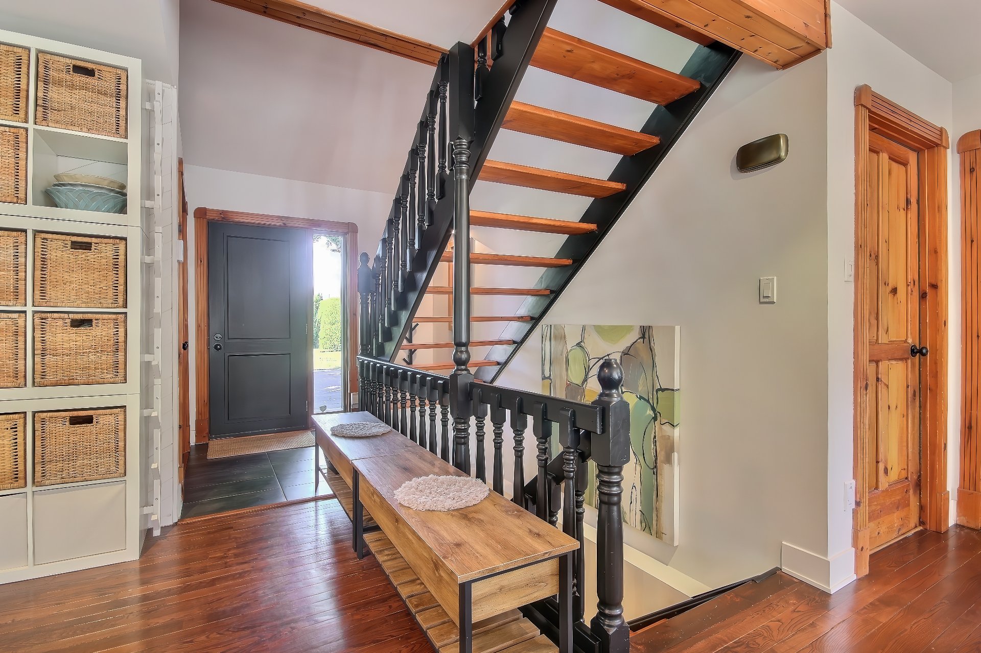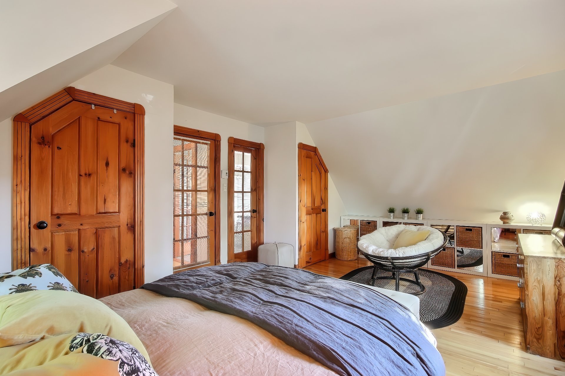 poutres apparentes au plafond, portes champêtres en pin,