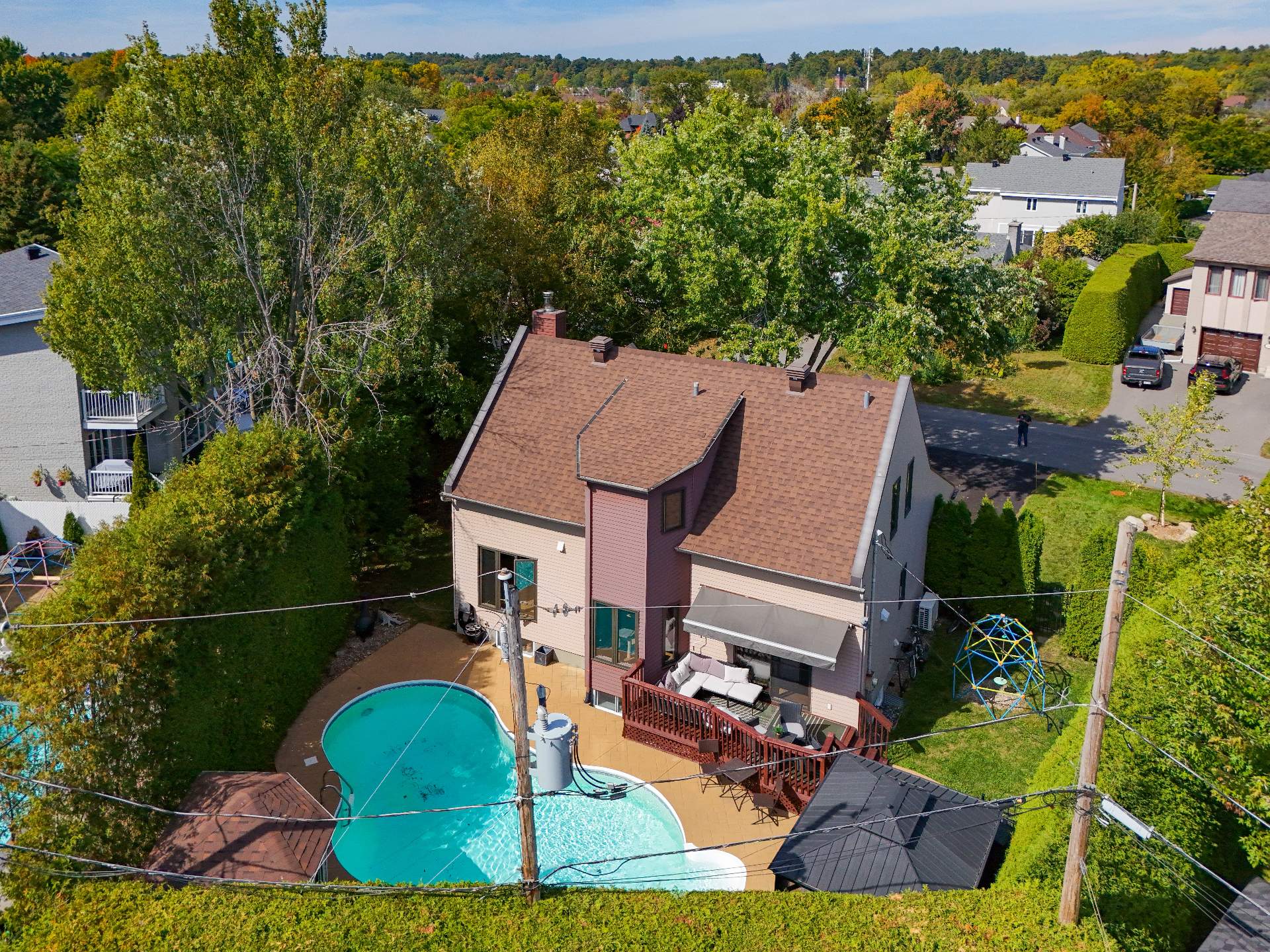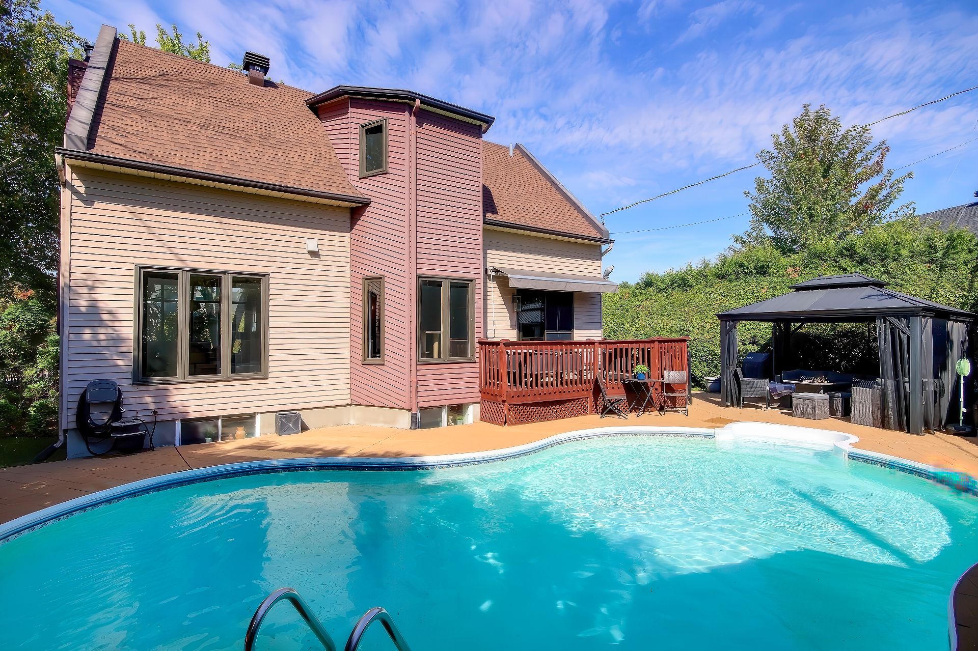 Située dans une rue paisible de Rosemère, cette chaleureuse propriété familiale séduit par son vaste salon avec foyer et verrière, sa cuisine moderne ouverte sur une cour intime, sa piscine creusée au sel chauffée, son gazebo et son cabanon. Elle offre 4 cac, 2 sdb, 1 salle d'eau avec buanderie et une grande salle familiale au sous-sol. À proximité de nombreuses écoles réputées, d'un golf, des parcs et des pistes cyclables, elle combine confort, luminosité et qualité de vie exceptionnelle.