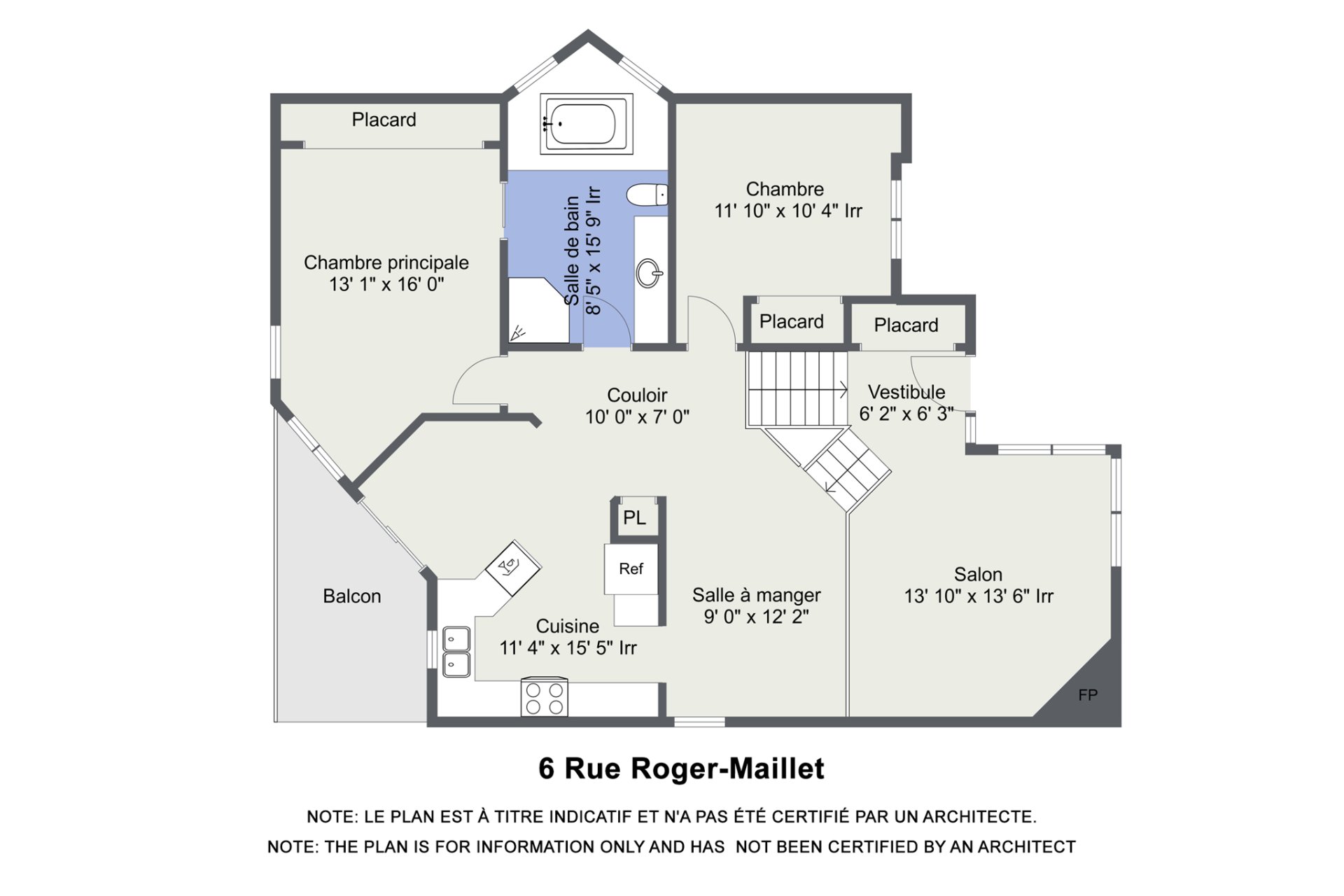 | Chambre à coucher principale | 4.0 x 3.5 M | 2ième étage | Bois |