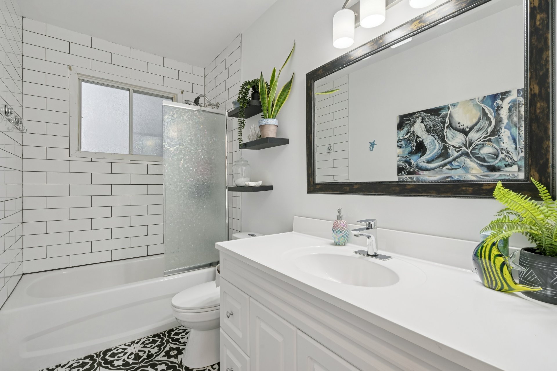 - Salle de bain moderne : bain, vanité et plancher de